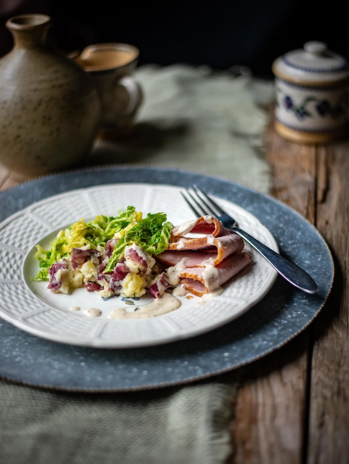 -Traditional Corned Beef on and a Whole Grain Mustard Sauce served with Boxty Potato Pancakes